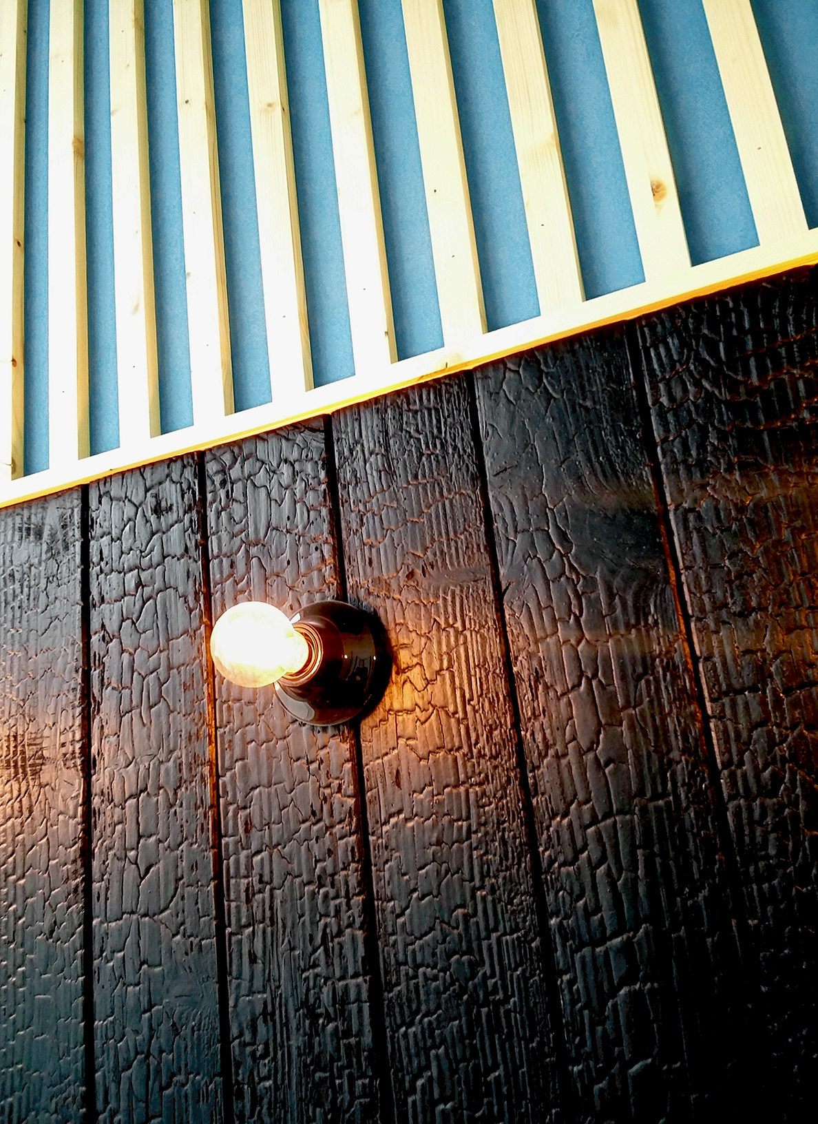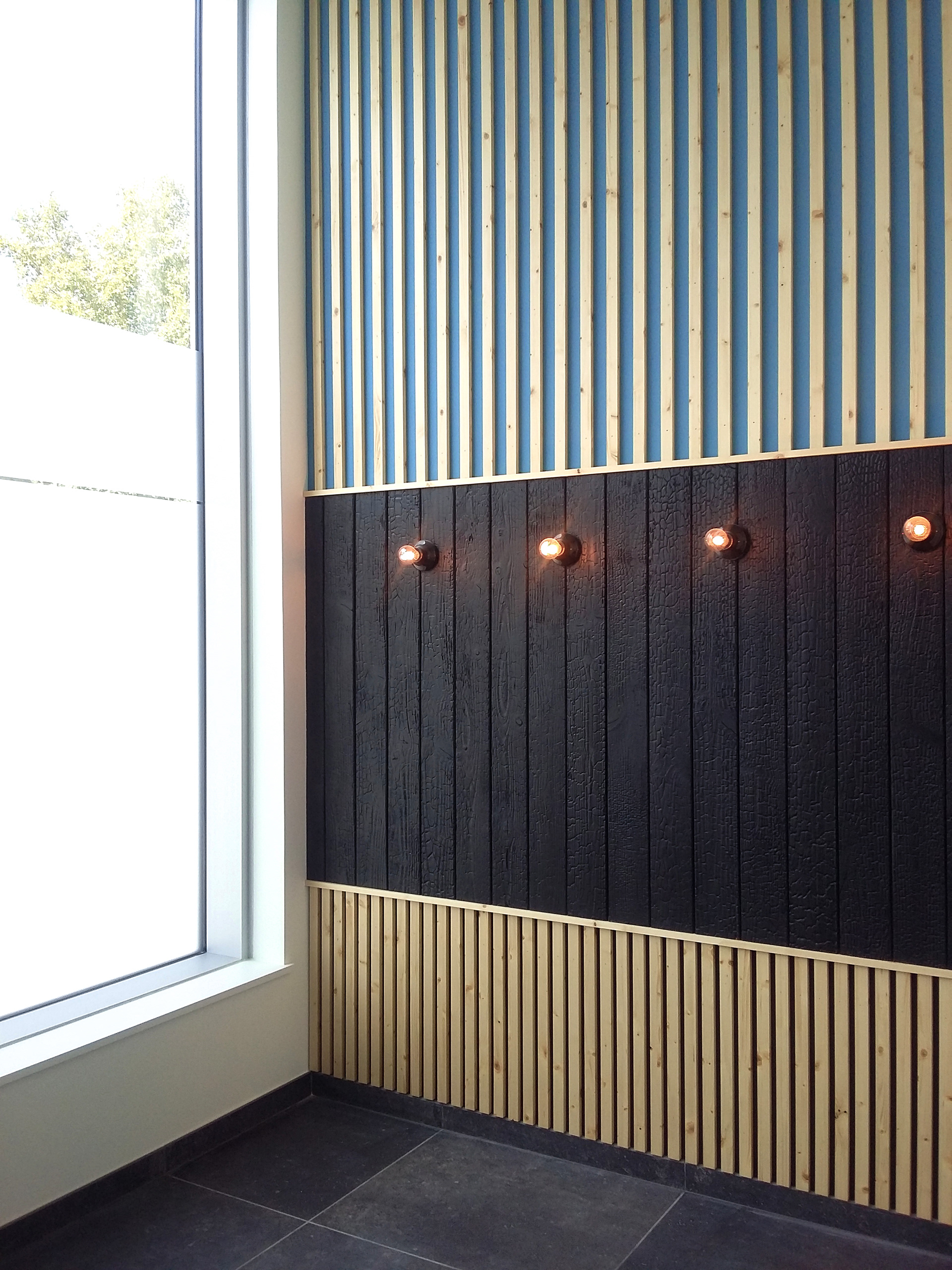 Les matériaux interprètent les symboles mythologiques de la médecine : le bâton de bois (parement à claire-voie), le serpent (texture du bois brûlé) et le miroir.