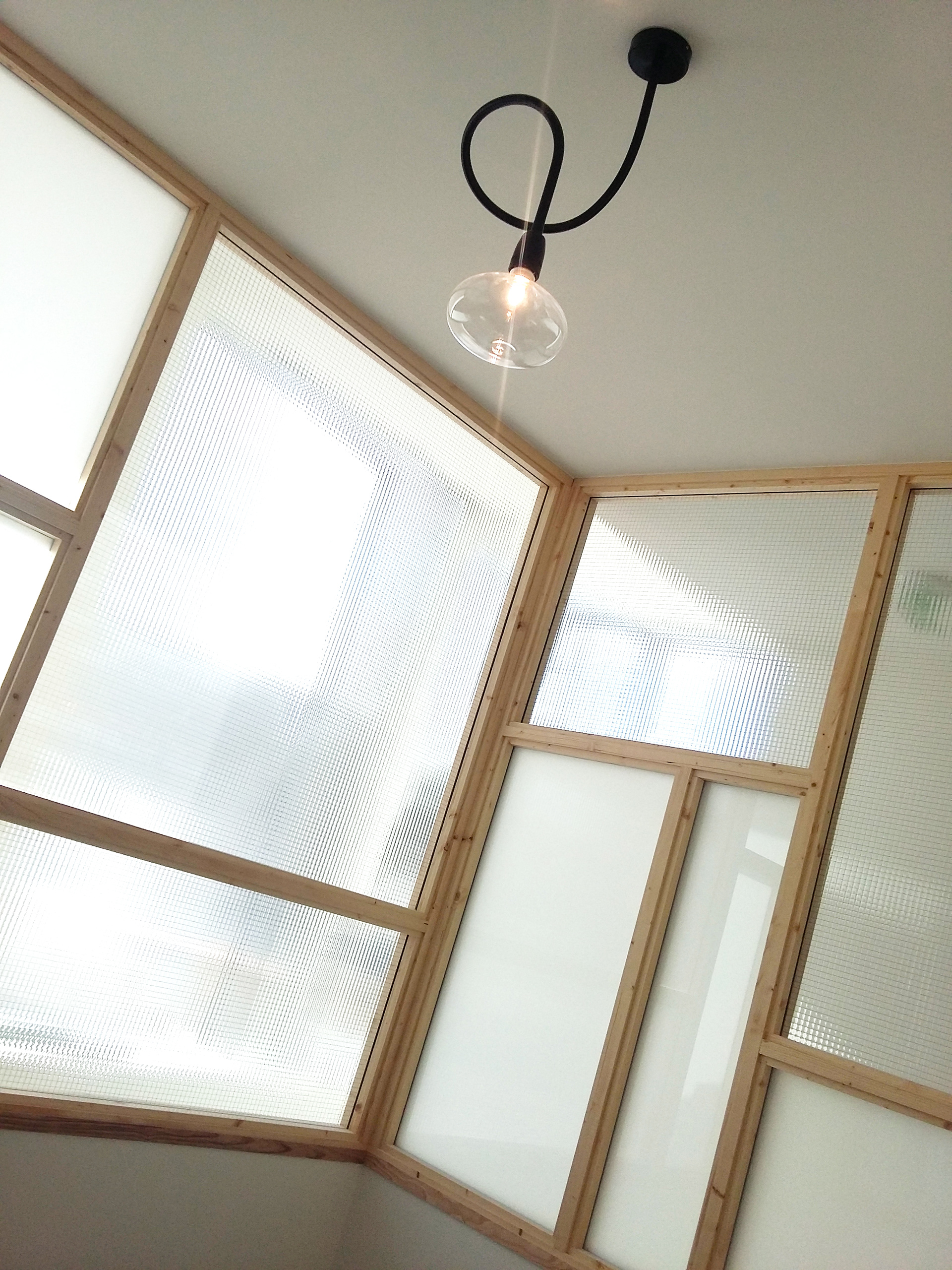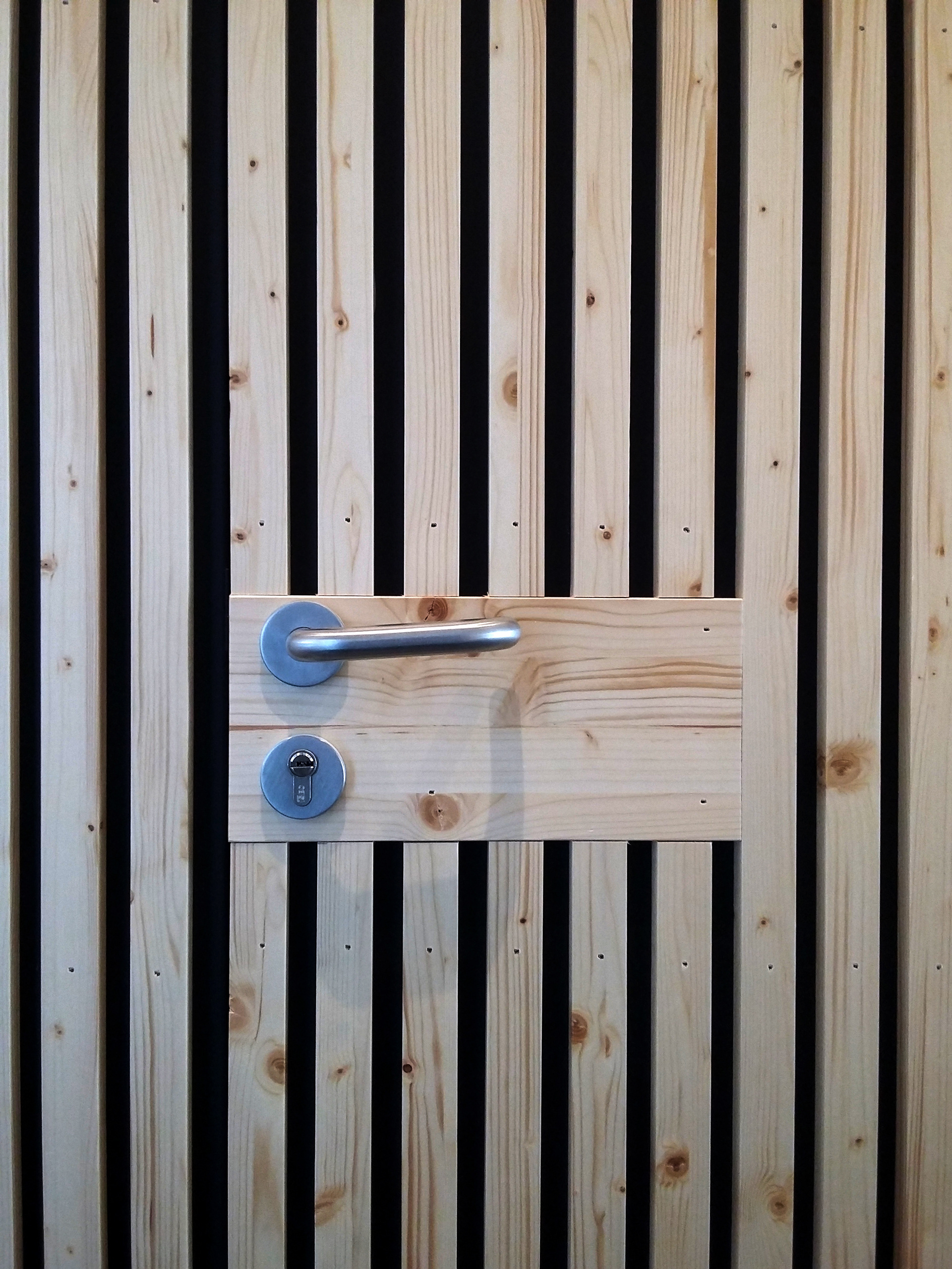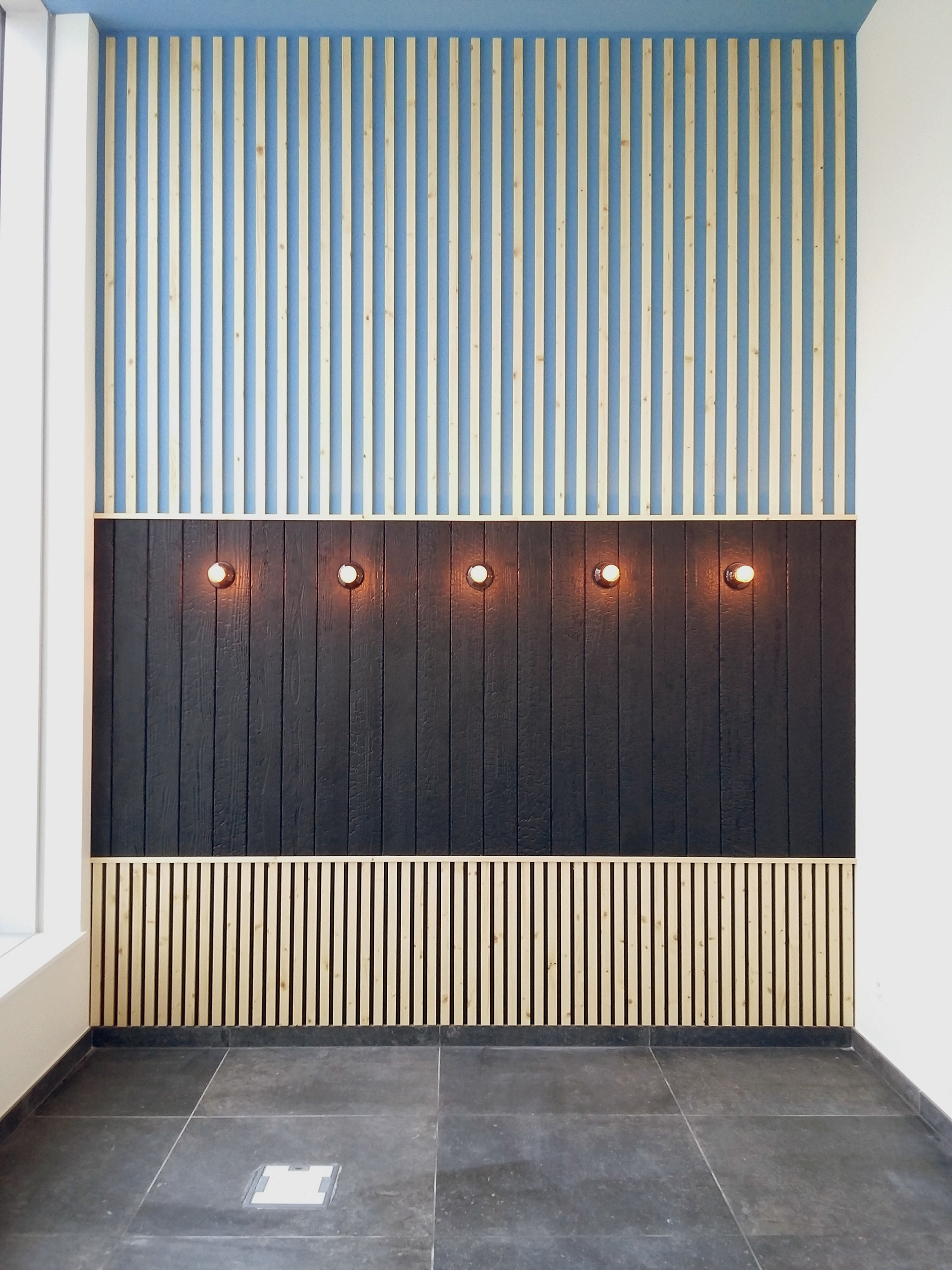 Le parement en bois dissimule les locaux privatifs et accompagne le public depuis l'accueil vers les salles d'attente des médecins.